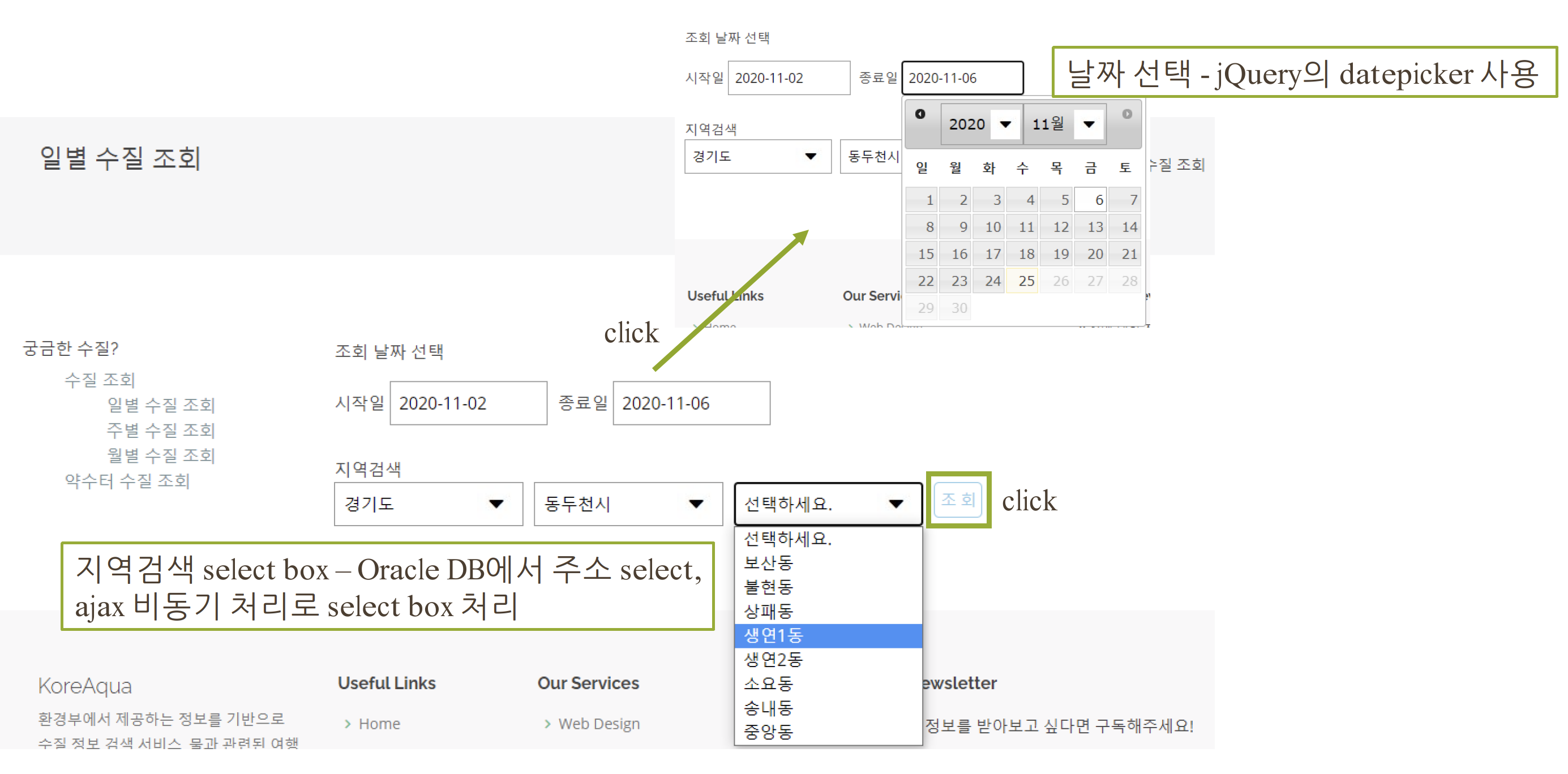 1. 행정구역과 정수장 정보를 DB에 넣은 후 SQl문으로 관할 지역에 맞게 selectbox가 나오게 설정하였다.