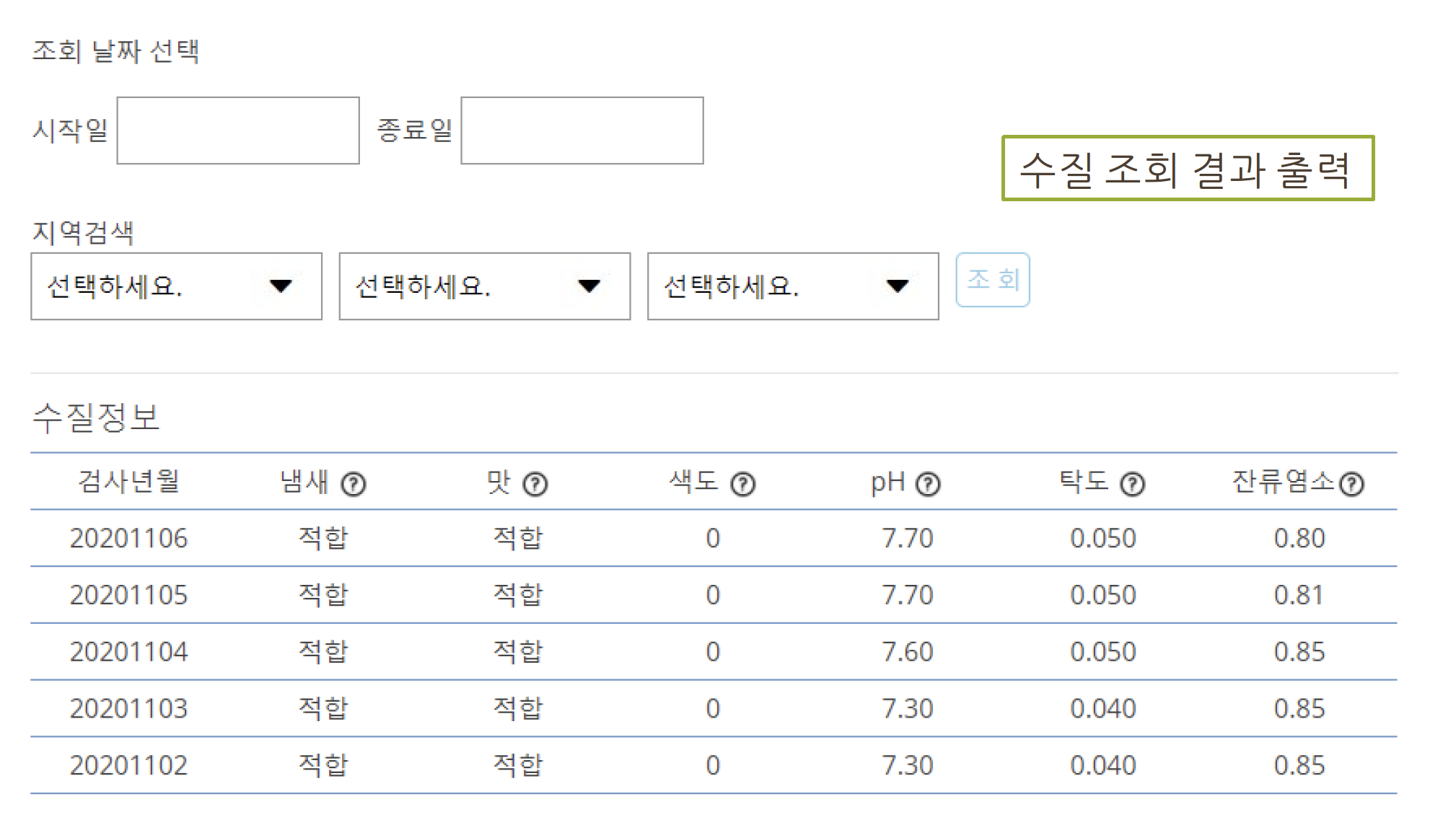 - 사용자가 조회하고 싶은 지역의 수질정보를 조회할 수 있는 수질 조회 페이지