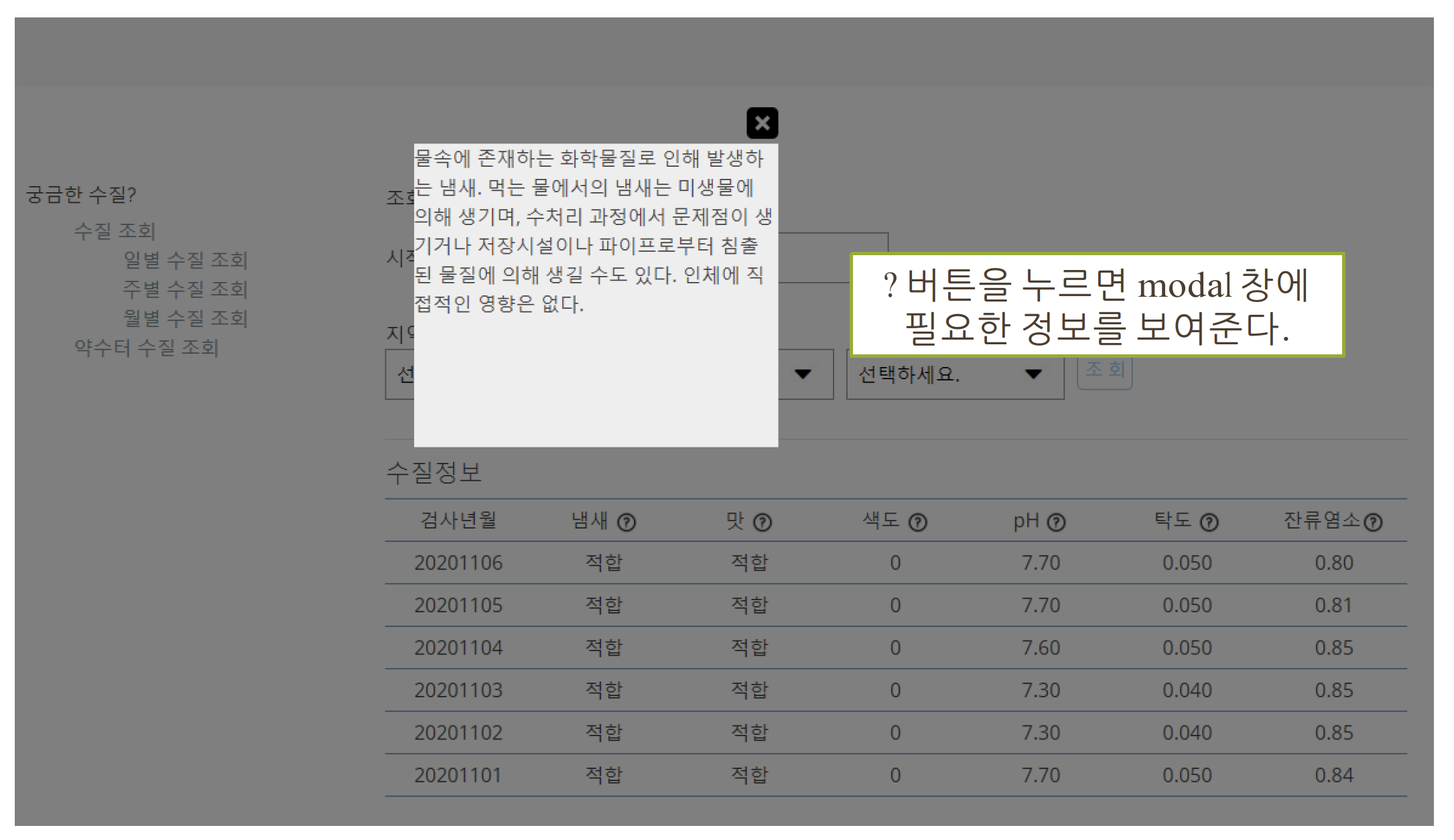 4. 익숙하지 않은 수질 데이터 용어를 모달창을 이용하여 사용자가 확인 할 수 있게 제작하였다.
